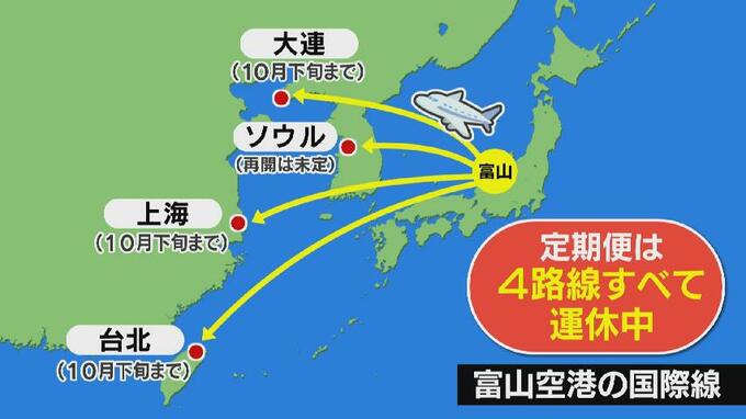 富山空港では大連・ソウル・上海・台北の4つの国際定期便すべてが運休していて、富山からの予約は他の地域に比べても苦戦して伸び悩んでいるといいます。