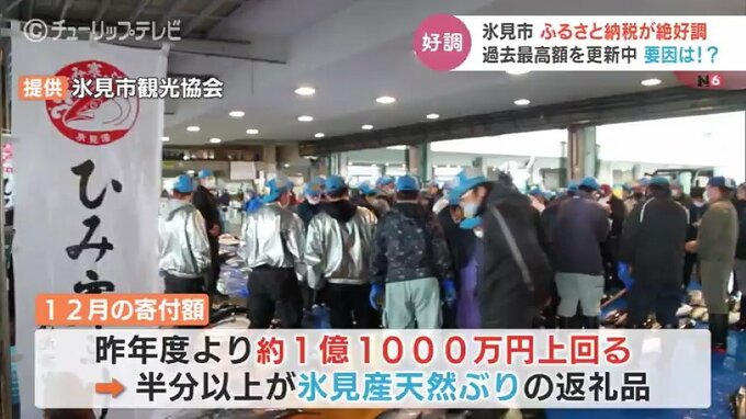 今年度はブリ漁が好調でひみ寒ぶり宣言が例年よりも早い11月26日に発表。それに伴い、寄付額がぐんぐんと伸び12月だけでもおよそ1億1000万円昨年度を上回りました。そのうちの半分以上の額が氷見産の天然ぶりに関するものだということです。