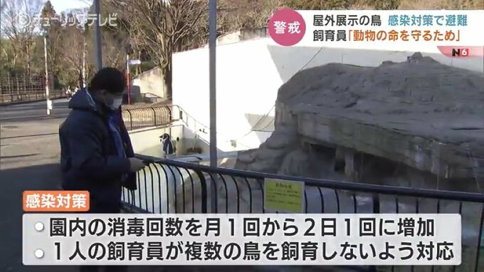 鳥インフルの感染対策として、園内の消毒回数を月1回から2日1回に増加。また、飼育員を経由して感染する場合を想定し、1人の飼育員が複数の鳥を飼育しないよう神経を尖らせています。そのほかにも…。