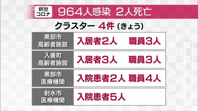 発表されたクラスターは4件で、黒部市と入善町の高齢者施設、黒部市と射水市の医療機関で感染拡大が確認されています。
