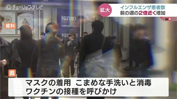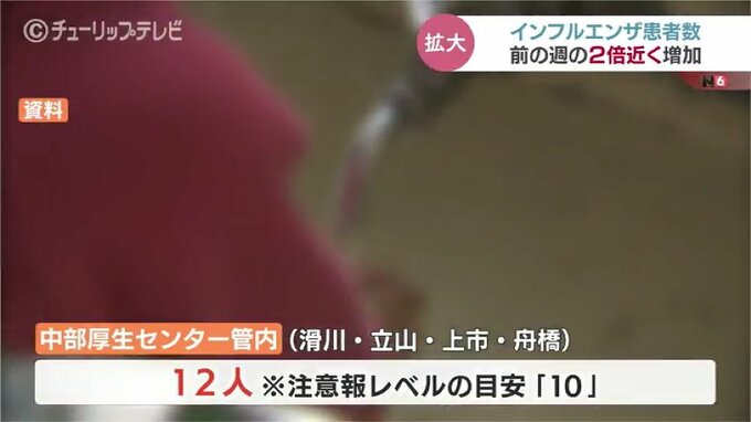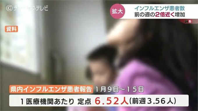 インフルエンザの患者数が急増しています。今月9日から15日までの1週間に、富山県内48か所の定点医療機関で確認されたインフルエンザの患者数は、1医療機関あたり6.52人となり前の週の3.56人からさらに増えました。