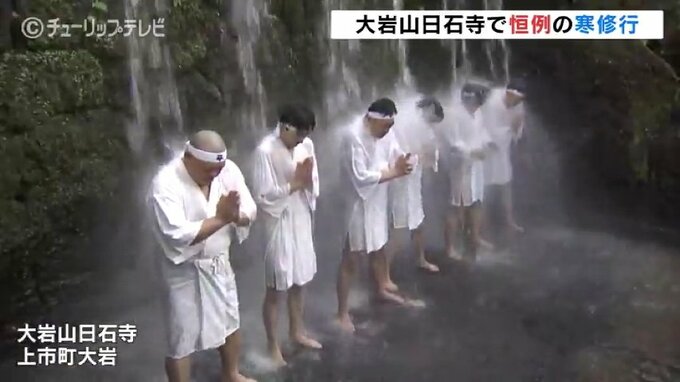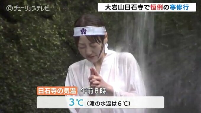 これは5・5メートルの高さから流れ落ちる6本の滝に打たれることで、五感と心のけがれを払い煩悩を洗い落とすものです。午前8時の気温は3度と、この時期としては高めでしたが、白装束をまとった男女およそ40人が次々と水温6℃の滝に打たれて気持ちを新たにしていました。