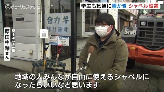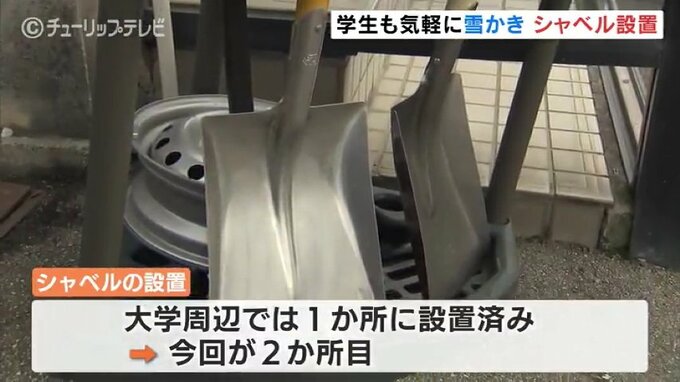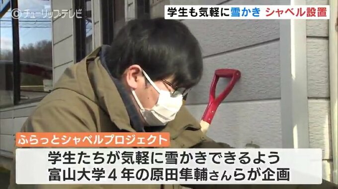 この取り組みはシャベルを持っていない一人暮らしの学生たちが気軽に雪かきできるよう富山大学4年生の原田隼輔(はらだ・しゅんすけ)さんらが企画したものです。