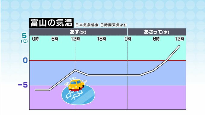 24日夕方は、富山県内どこも氷点下でした。さらに25日朝は、富山でマイナス5.7℃、高岡市伏木で5.9℃まで下がります。