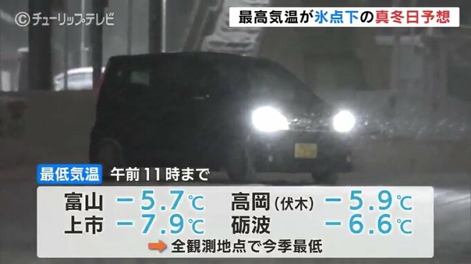 きょう日中の予想最高気温は富山、高岡市の伏木ともに氷点下1℃と、最高気温が0℃を下回る「真冬日」となりそうです。