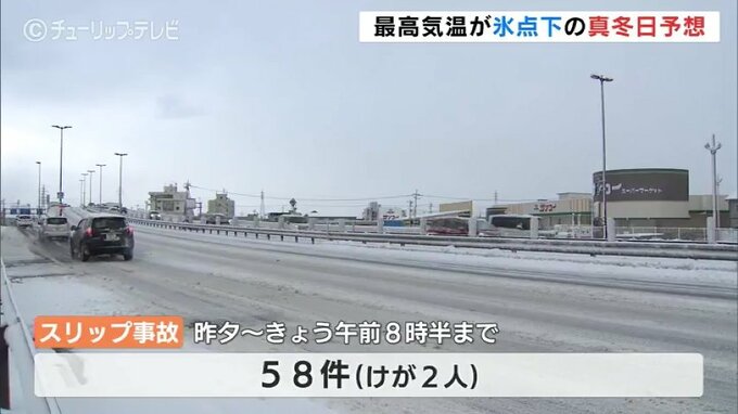 昨夜から凍結などで路面状態が悪化し、警察のまとめではきのう夕方からけさ8時半までの間に58件のスリップ事故が発生し、2人がけがをしましたが、きょう、通勤時間帯の国道8号などで大きな混乱はみられませんでした。