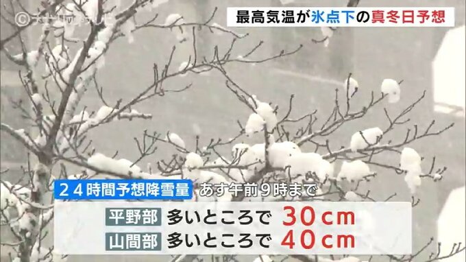 あす朝9時までの24時間予想降雪量は東部西部ともにいずれも多いところで平地で30センチ、山間部で40センチとなっています。