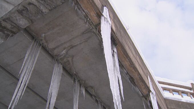 長いものでは1メートル以上あるつららがずらり。橋脚を覆うかのように水が凍りその光景はまるでアートのようです。