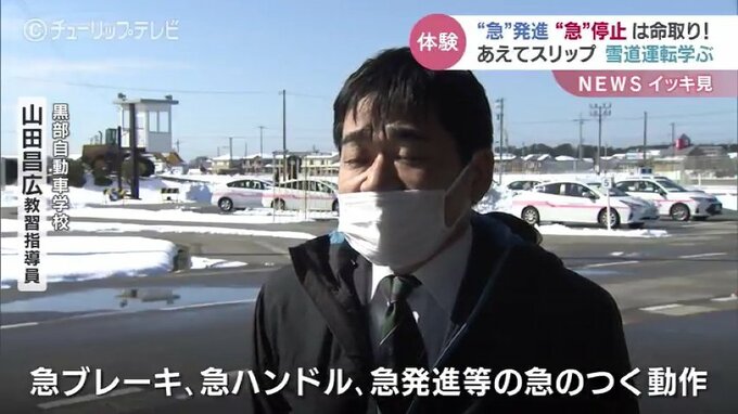 黒部自動車学校 山田昌広 教習指導員:「急ブレーキ、急ハンドル、急発進等の急のつく動作、これをしてしまうとどうしても事故につながってしまうので、急のつく動作をしないように心にゆとりを持って車間距離を空けて運転するようことが大事だと思います」