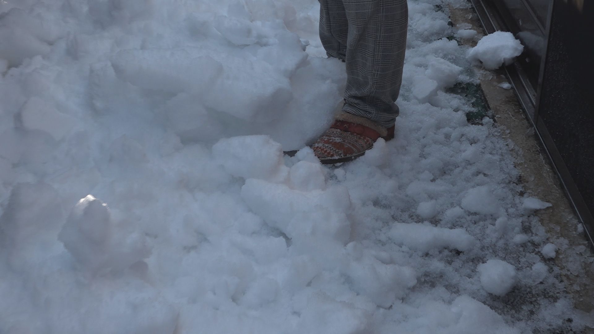 自宅の外に出た男性は、盆栽棚の上に積もった雪を、黙々と下ろし始めました。