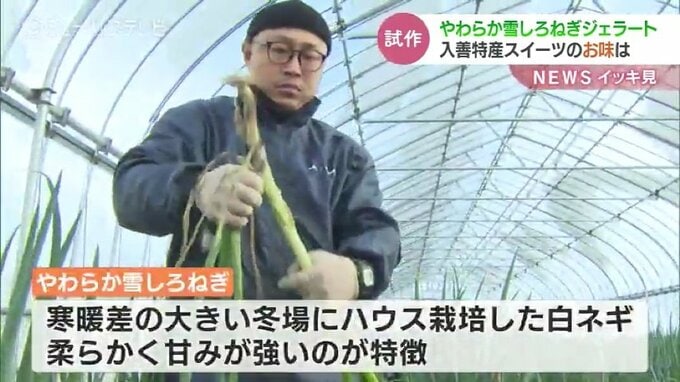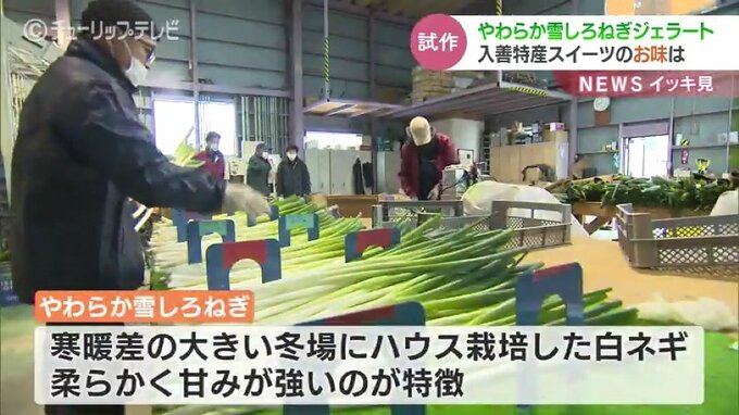 入善町商工会女性部では昨年度からこの白ネギを使ったジェラートの開発に取り組んでいて、ジェラート1個に最大15グラムの白ネギが含まれています。