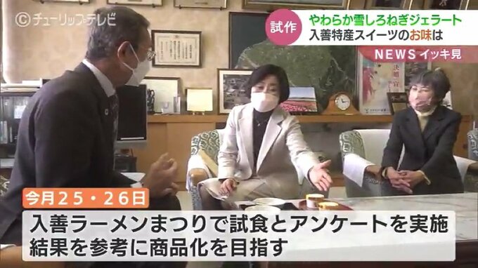 笹島町長には少し物足りなかったようですが、「雪しろねぎジェラート」は2月25日26日の入善ラーメンまつりで来場者向けに試食とアンケートを行い、その結果を参考に商品化を目指します。