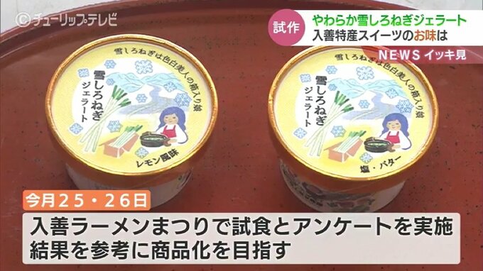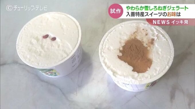 特産のネギを使ったジェラートです。富山県入善町特産の「やわらか雪しろねぎ」を使ったジェラートの試作品が完成しました。レモン風味と塩バター風味の2種類です。