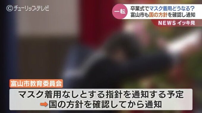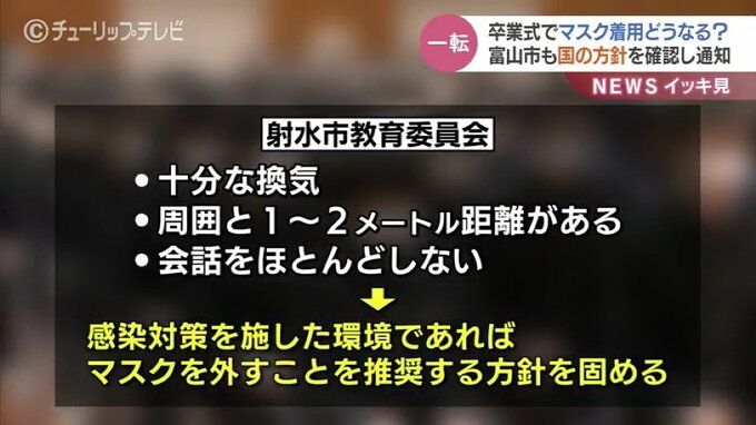 卒業式でマスクを外すかどうか…政府が方針の検討を進める中、富山県の射水市教育委員会は、十分な換気、周囲と1から2メートル距離があること、会話をほとんどしないなど感染対策を施した環境であれば、マスクを外すことを推奨する方針を固めました。