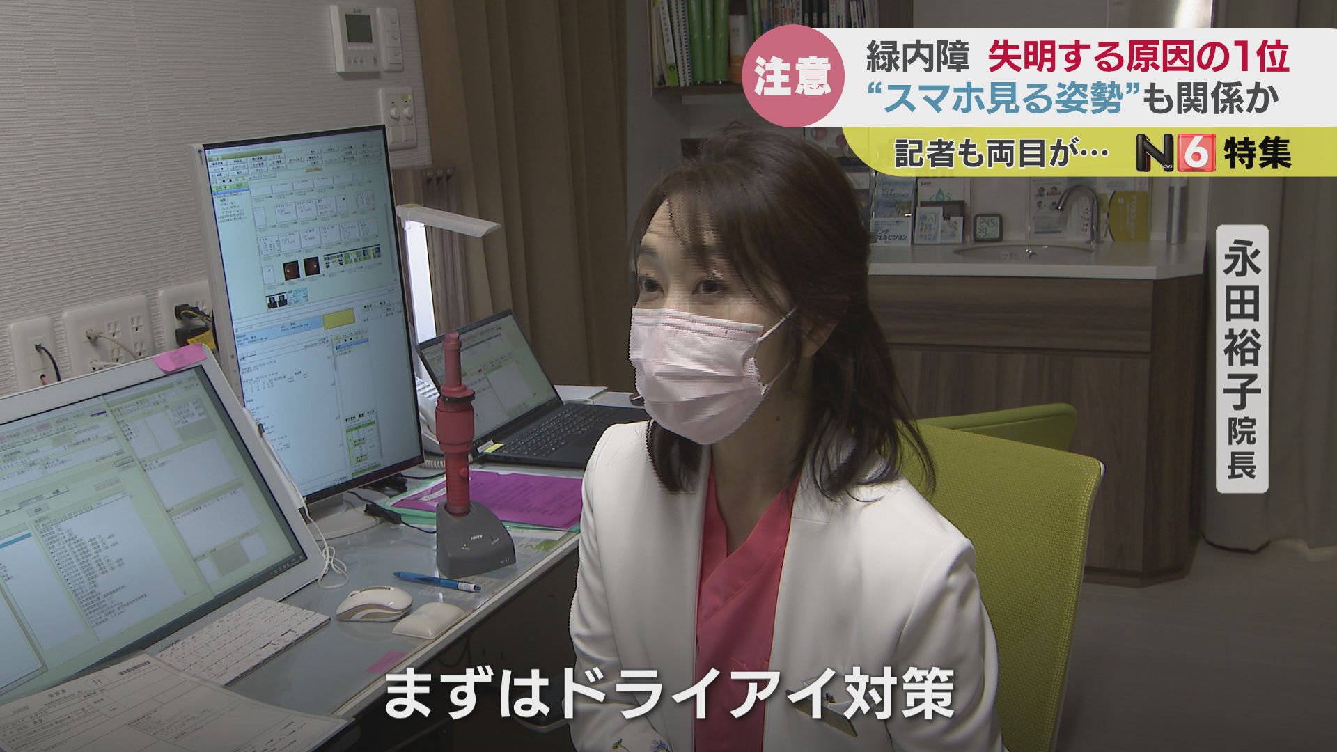 永田裕子院長:「近眼は(緑内障の)リスクの一つですから。眼精疲労は、パソコンはもちろん、パソコン・スマホをやっているとドライアイが引き起こされて。ドライアイになると、眼精疲労が早く起こるので、いま暖房が入っている時期なので、それもあって。まずはドライアイ対策(が大切)」