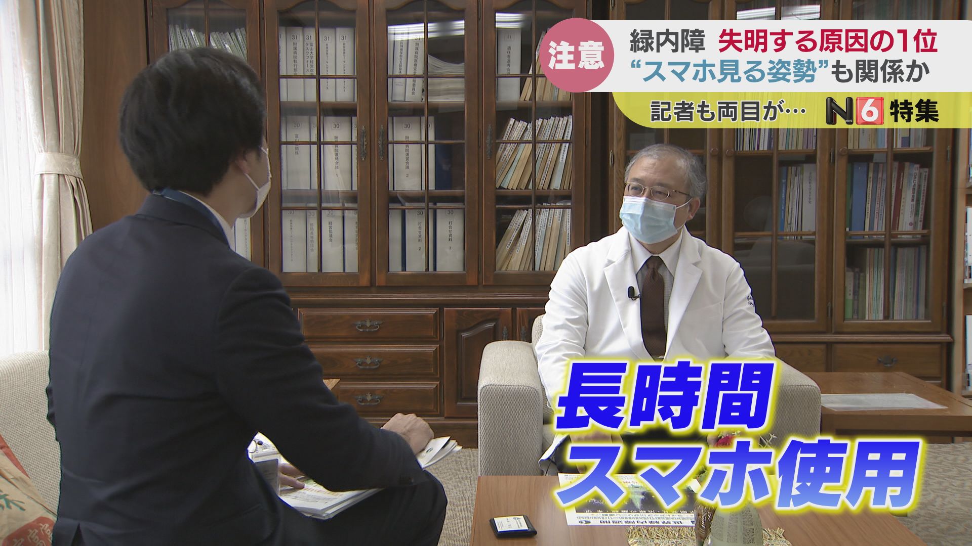 富山大学附属病院 林篤志病院長:「スマホについてはこう、必ずうつむき加減で使いますよね。うつむいている姿勢が長時間続くと眼圧が高めになってしまうんですよ。こう、首がしっかり曲がっているぐらいの角度だと思いますね。これぐらいかなやっぱり…」