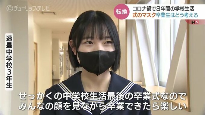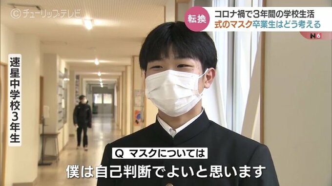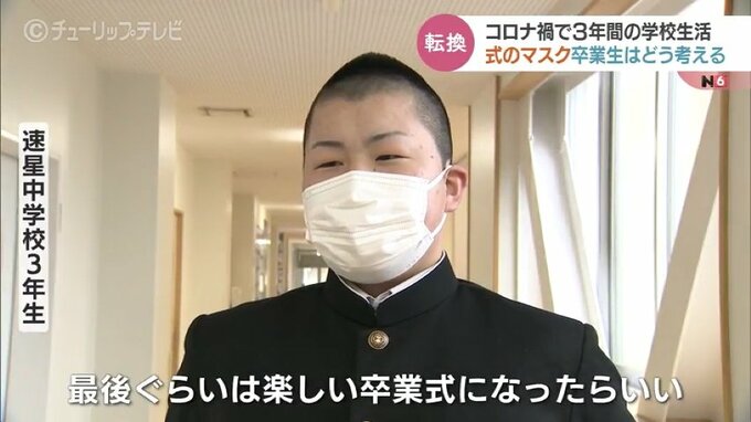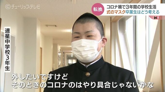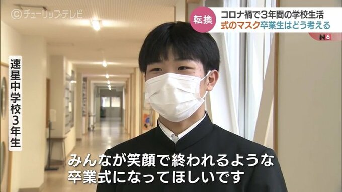 男子生徒:「みんなが笑顔で終われるような卒業式になってほしいです。(記者:マスクについては?)僕は自己判断でよいと思います。インフルエンザも最近流行っているから、まだ感染のリスクもあるから、怖い人もおると思うからです」