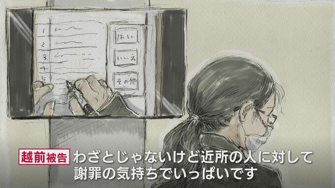 越前被告の筆談:「わざとじゃないけど近所の人に対して謝罪の気持ちでいっぱいです。そしてお父さん、お母さんに対しても謝罪の気持ちでいっぱいです」