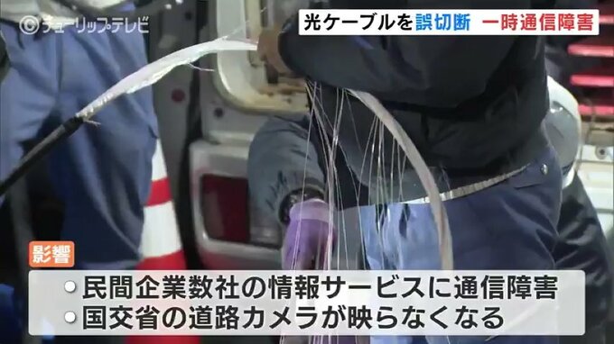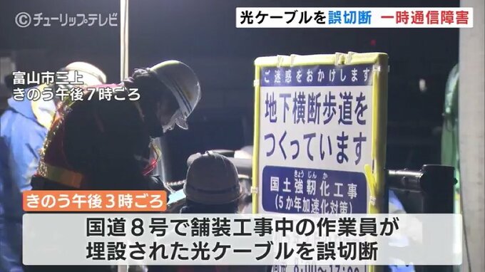 14日午後、富山市の国道の舗装工事で、作業員が誤って光ケーブルを切断し、民間企業の情報サービスに一時、通信障害が生じました。