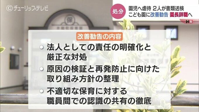 去年12月、富山市の認定こども園で園児を虐待したとして保育教諭2人が書類送検された事件で、市は園を運営する学校法人に対し15日付けで改善勧告を出しました。園長は今年度末で辞職します。