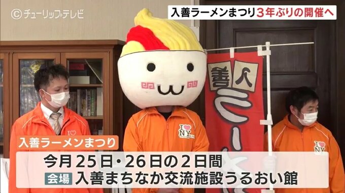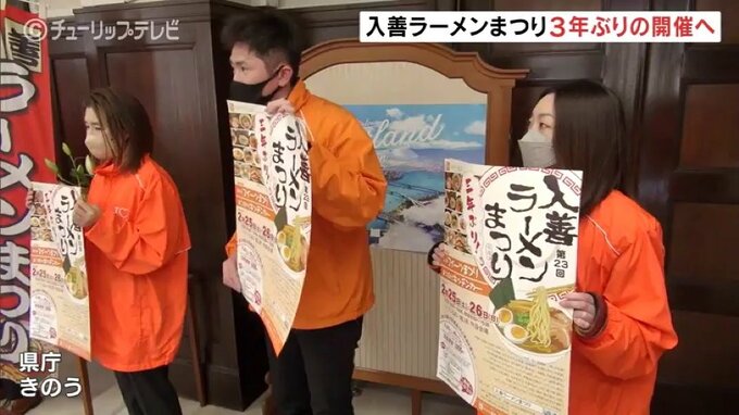 3年ぶりの開催です。今月25日からの「入善ラーメンまつり」キャラバン隊が、新田知事にイベントの魅力をPRしました。