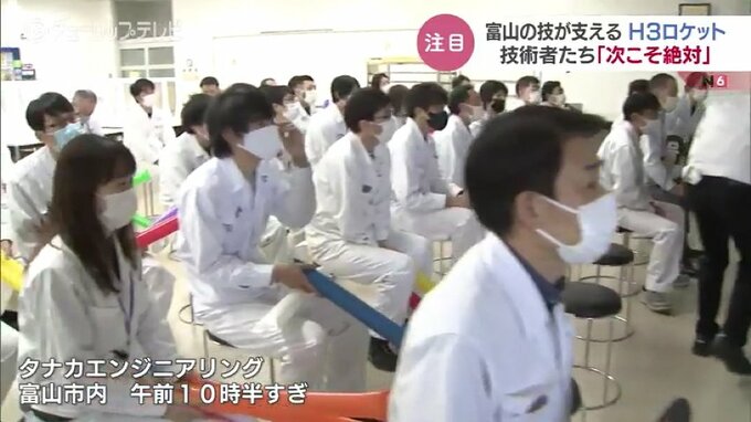 H3ロケット1号機の打ち上げを見守る富山市の技術者たち。