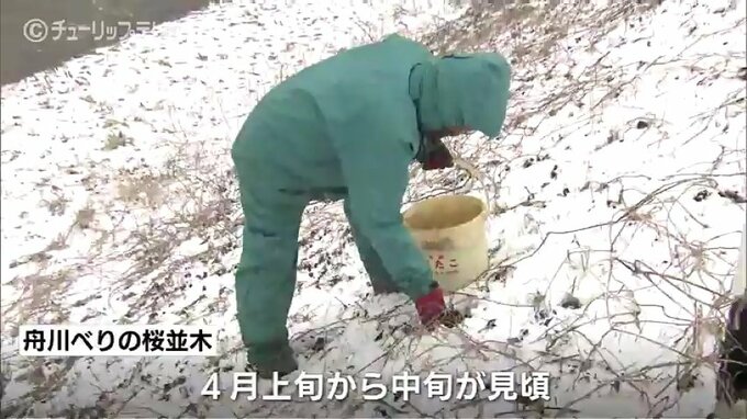 朝日町の舟川べりでは、26日、「桜堤(さくらづつみ)の会」の会員15人が約280本のソメイヨシノに肥料を与える作業を行いました。