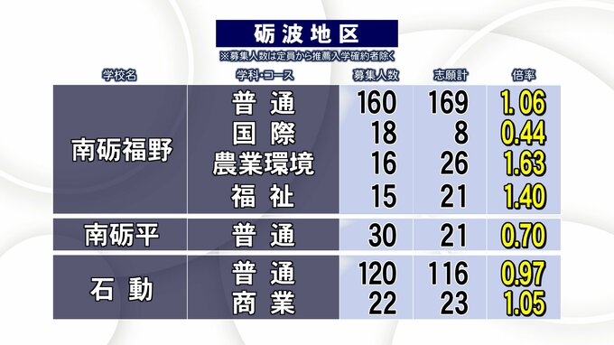 ニュースクリップ 富山県 公立高校入試 2023年志願倍率 平均志願倍率は1.02倍 最高は富山中部探究科学科2.28倍 2023年2月27日(月) 15:50 国内 県立高校・全日制課程の一般入試は3月8日と9日に行われます。合格発表は3月16日の午後0時半です。