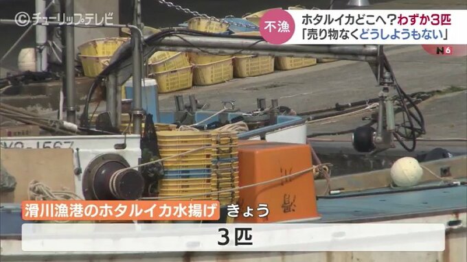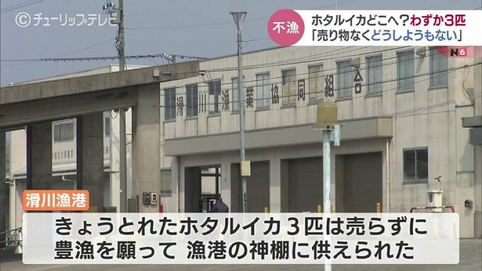 ホタルイカが観光の目玉としている滑川市。しかし、滑川漁港では、ホタルイカの水揚げがたった3匹でした。漁港の関係者によりますと、きょう水揚げされた3匹は売らずに、滑川漁港にある神棚に供えたということです。