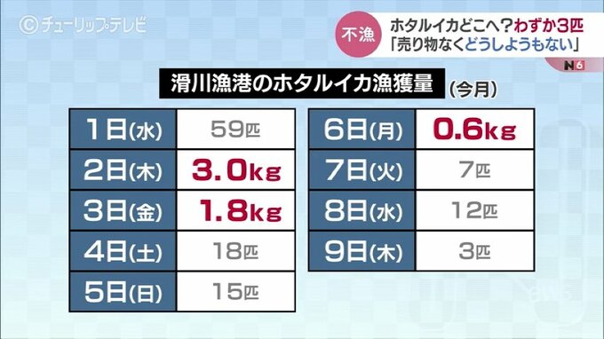 ホタルイカは深海に生息していますが、滑川漁港の関係者は「これから海が荒れたりして、富山湾の水がかき混ぜられるとか、そんなことでもないとホタルイカはやってこないんじゃないか…」と悲観的な言葉をもらしました。