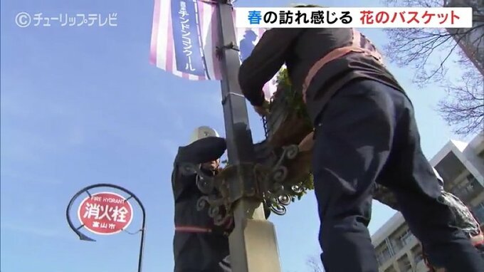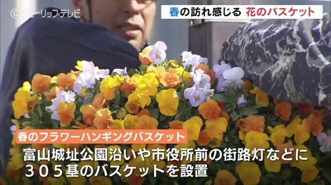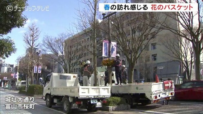 季節ごとの花々で街のにぎわいを演出しようと、富山市の中心市街地に春の花のハンギングバスケットが設置されました。