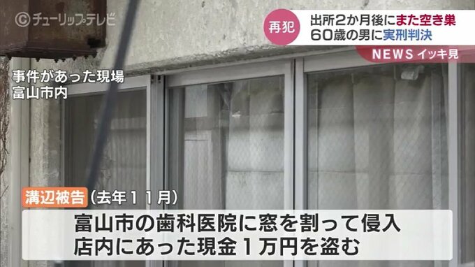 判決によりますと、溝辺被告は去年11月の深夜、富山市の歯科医院に工具で窓を割って侵入。なかにあった現金1万円を盗んだとされています。