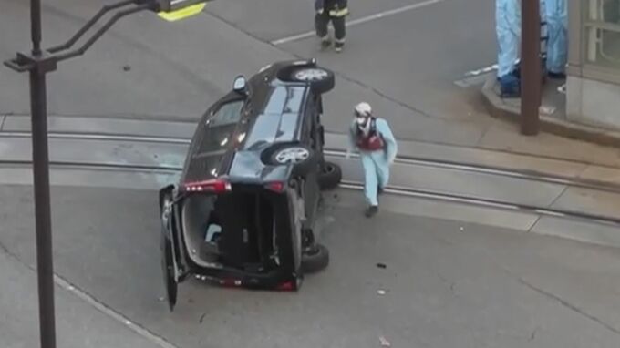 線路内で横転する車。バックドアが開き事故の衝撃の強さが分かります。帰宅時間帯の事故、現場には多くの警察や消防の姿が確認できます。
