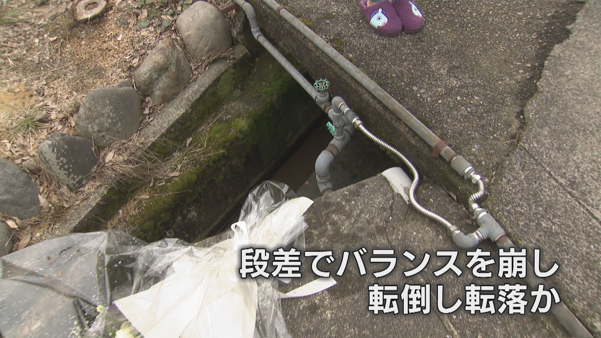 日中は見えますが、夜になれば街燈もないため、段差やパイプがよく見えないそうです。浅野さんがバランスを崩して用水路に転倒した可能性があります。