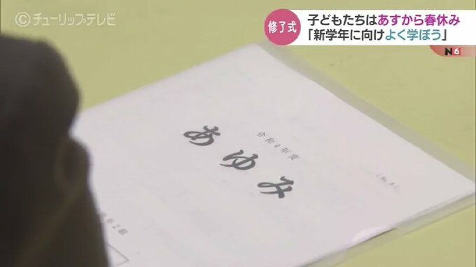 式では、各学級の代表に終了証が手渡され、松浦悟校長が「次の学年のスタートにむけて、よく学ぶ春休みにしてくださいと」とあいさつしました。