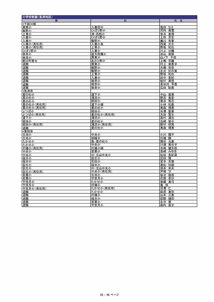 富山県 教職員人事異動・退職2023【小学校教諭名簿】あの先生どこ行ったがけ? 2023年3月27日(月) 16:20 国内 富山県教育委員会は27日、小学校教諭の4月1日の人事異動を発表しました。 小学校教諭(魚津地区)