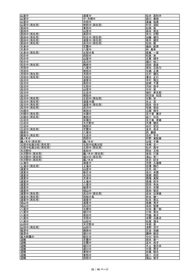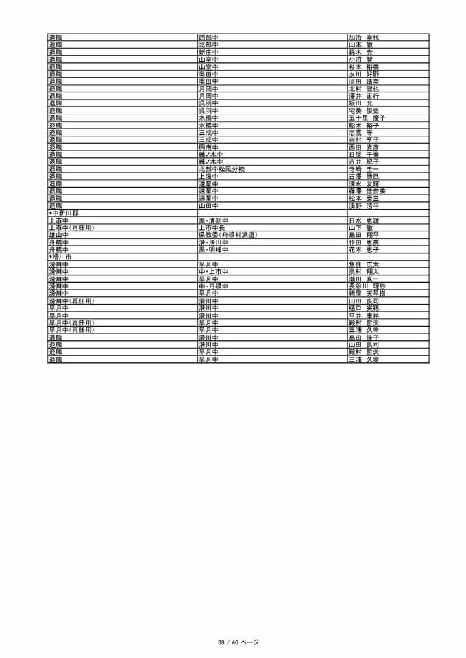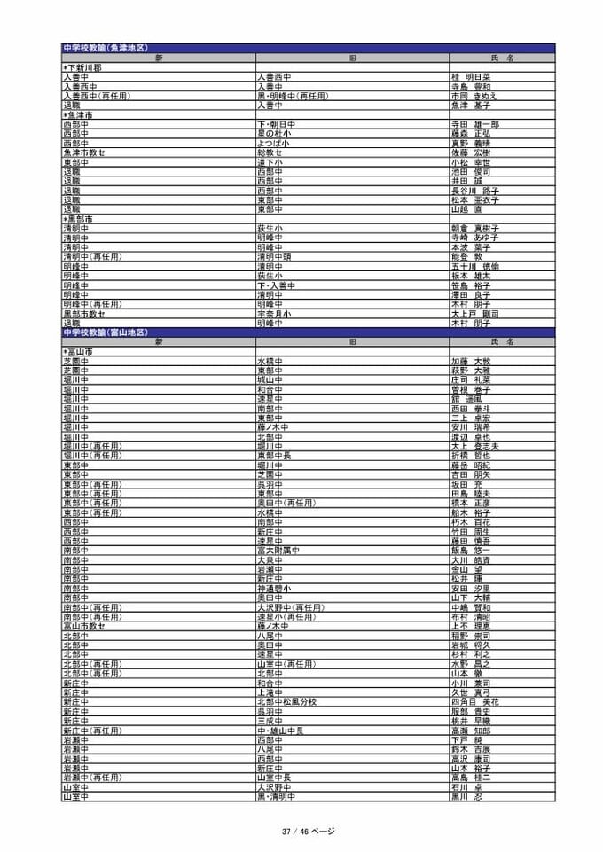 富山県 教職員人事異動・退職2023【中学校教諭名簿】あの先生どこ行ったがけ? 2023年3月27日(月) 16:45 国内 富山県教育委員会は27日、中学校教諭の4月1日付の人事異動を発表しました。義務教育学校、栄養教諭を含みます。 中学校教諭(魚津・富山地区)