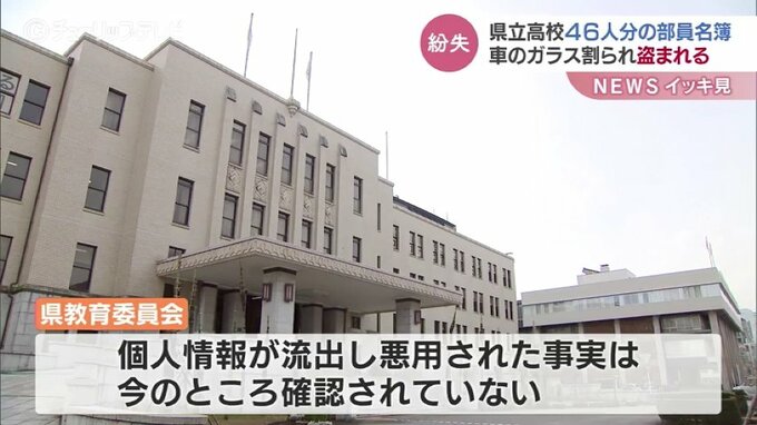 富山県の県立高校部活動に所属する生徒46人分の個人情報が記載された部員名簿が盗まれていたことがわかりました。