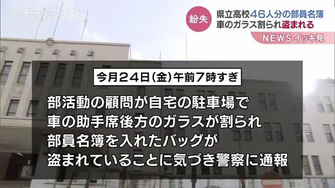 3月24日の午前7時過ぎに部活動の顧問が自宅の駐車場で、助手席後方のガラスが割られ部員名簿を入れたバッグが盗まれていることに気づき、警察に通報。