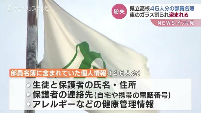 富山県教育委員会によりますと、盗まれた名簿には生徒と保護者の氏名や住所、保護者の連絡先に加えてアレルギーなどの健康管理情報が含まれていました。