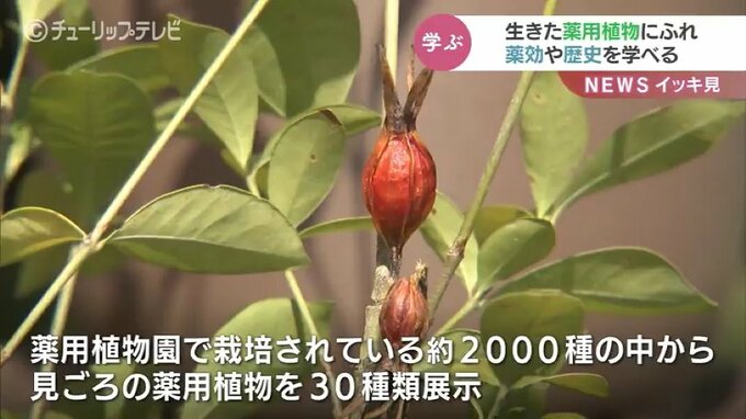 この展示は、普段見ることができない薬用植物園で栽培されているおよそ2000種の中から、見ごろの薬用植物を展示するものです。