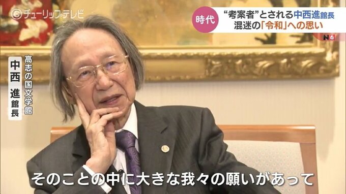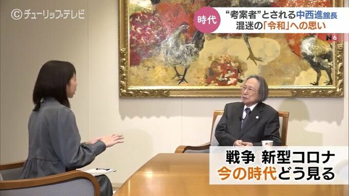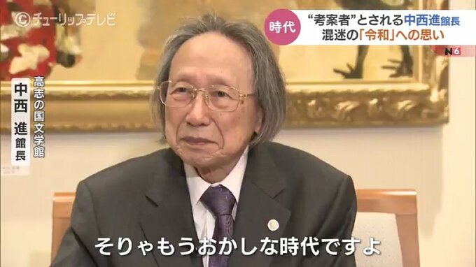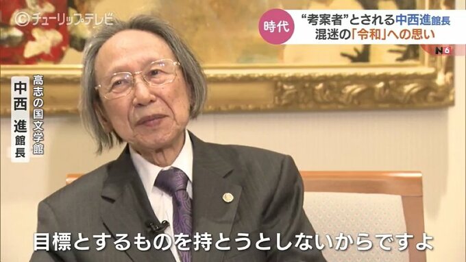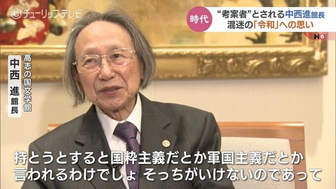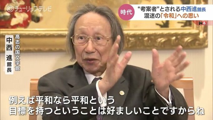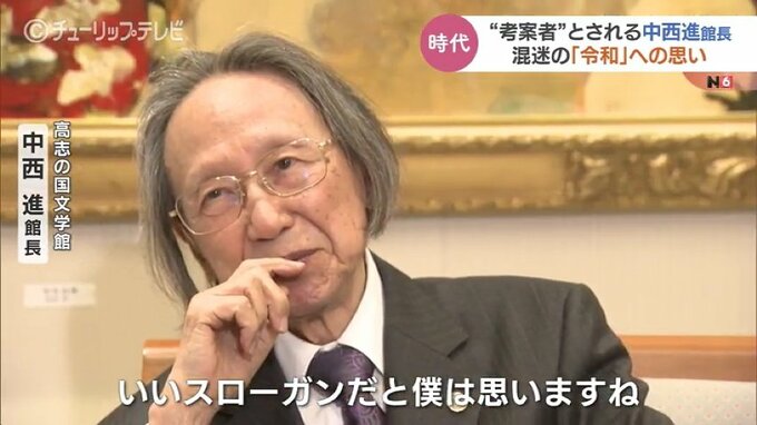 「そりゃもうおかしな時代ですよ。目標とするものを持とうとしないからですよ。持とうとすると、そりゃ国粋主義だとか軍国主義だとか言われるわけでしょ、そっちのほうがいけないわけであって、国民がひとつの願いを持ってる、大きな例えば平和なら平和というものを持つということは好ましいことですからね。そういうものを持とうとすることによって、いわば、我々はね、令和というものの中でこれを持とうとしてきたそのことの中に我々の願いがあって。いいスローガンだと僕は思いますね」