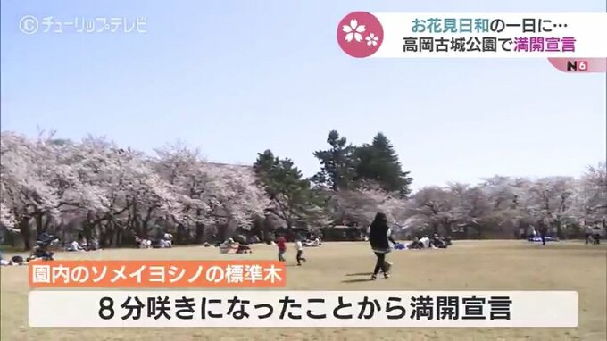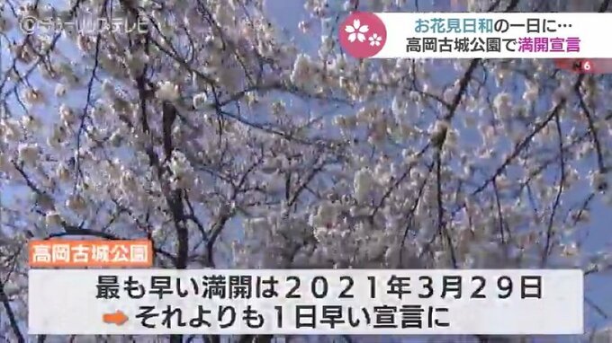 高岡古城公園管理事務所はソメイヨシノの標準木が8分咲きになったことから「満開宣言」を出しました。これまで最も早かったのが2021年3月29日でしたが、それよりも1日早い満開宣言です。