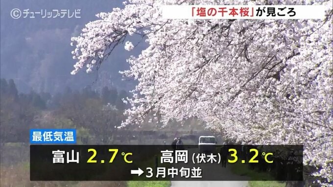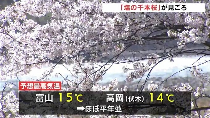 一日を通じて晴れの予想で日中の予想最高気温は富山で15度、高岡市の伏木で14度とほぼ平年並みで日差しが暖かく感じられる、絶好のお花見日和となりそうです。
