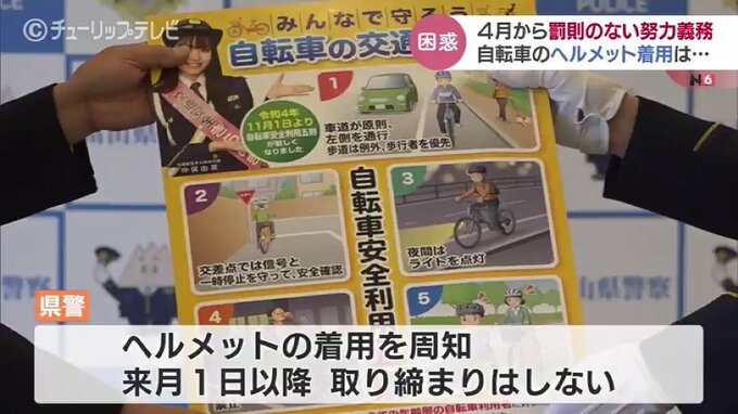 県警はヘルメットの着用を、ポスターなどで周知していますが、努力義務であるため、4月1日以降、ヘルメットをかぶっていない人を取り締まることはないということです。