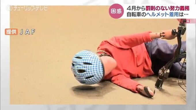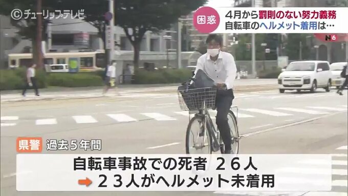 県警によりますと、県内の自転車事故で過去5年間に亡くなったのは26人、このうち23人がヘルメットを着用していませんでした。