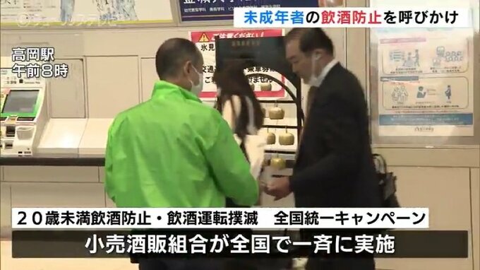 このうち、あいの風とやま鉄道の高岡駅では、組合のメンバーや高岡警察署の署員ら23人が、通勤通学途中の未成年者らに啓発チラシやティッシュを配布し「飲酒は20歳になってから」と呼びかけました。