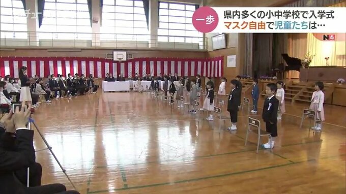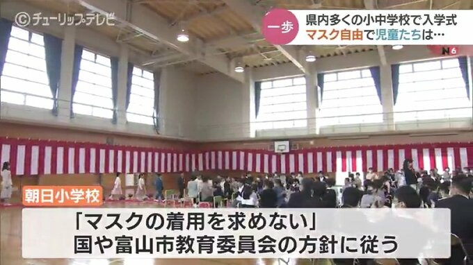 入学式でのマスクの着用について朝日小学校は国や教育委員会の方針に従い「マスクの着用を求めない」としました。その結果、新入生と教職員は全員マスクを外して出席。ひとりひとり名前を呼ばれると、元気よく応じていました。一方、保護者や在校生でマスクを外して出席したのは半数ほどと対応が分かれました。