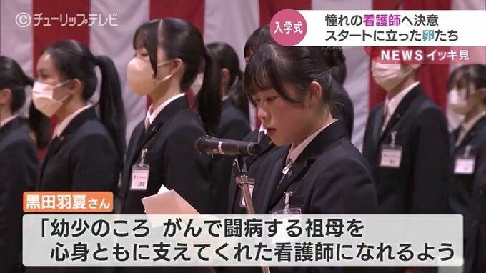 新入生を代表し、黒田羽夏さんが「幼少のころ癌で、闘病する祖母を心身ともに支えてくれた看護師になれるよう積極的な姿勢と優しい心を持って勉学に励みます」と決意を述べました。