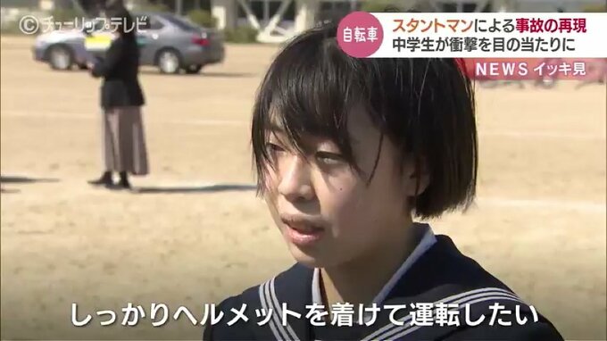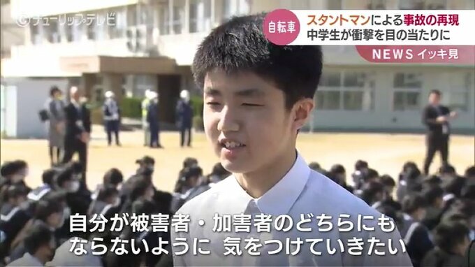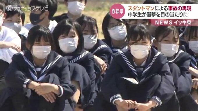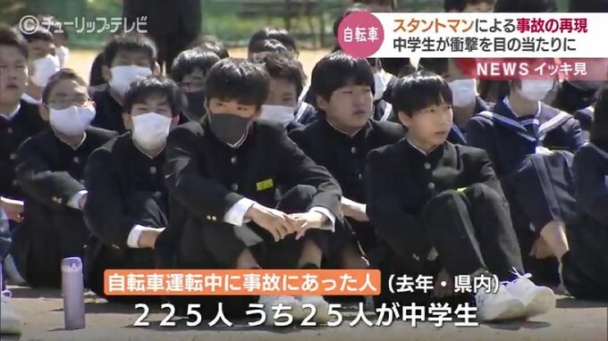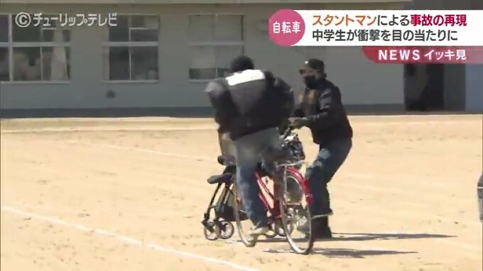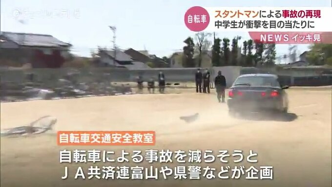 この日は富山市の山室中学校で、2人乗りや携帯電話で話をしながら自転車に乗るスタントマンが、車と衝突したり左折するトラックに巻き込まれたりする事故を再現しました。